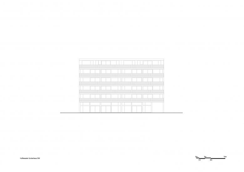 Die Überbauung besteht aus dem fünfgeschossigen Vorderhaus als Blockrandbebauung und dem im Garten freigestellten Hofgebäude.
