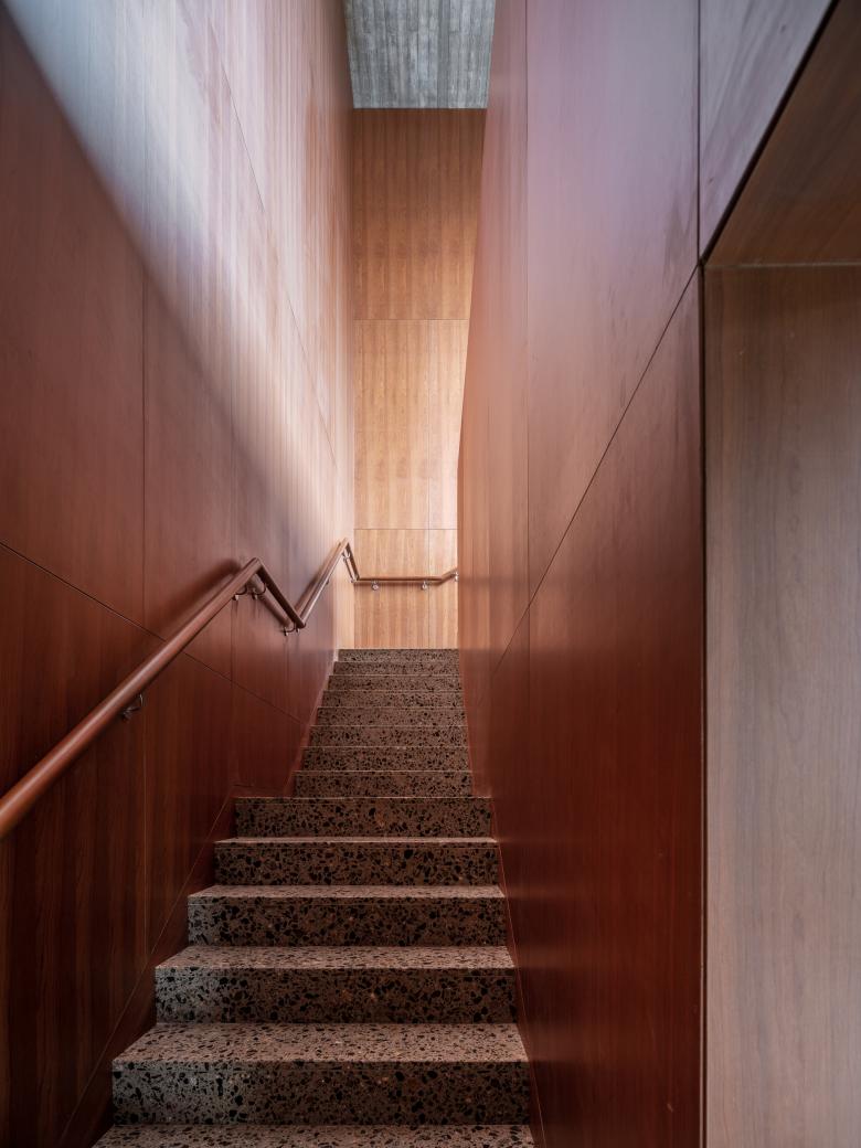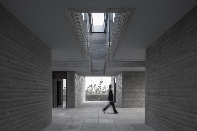 Reinforced concrete is used like clay to mold pure spaces. The textured surface of the exposed concrete poured in timber formwork is intended to avoid abstraction and give expression of tangibility to the spaces.
