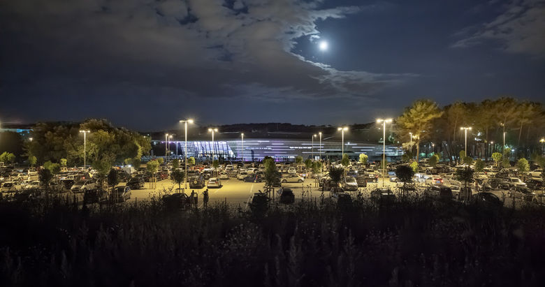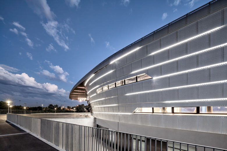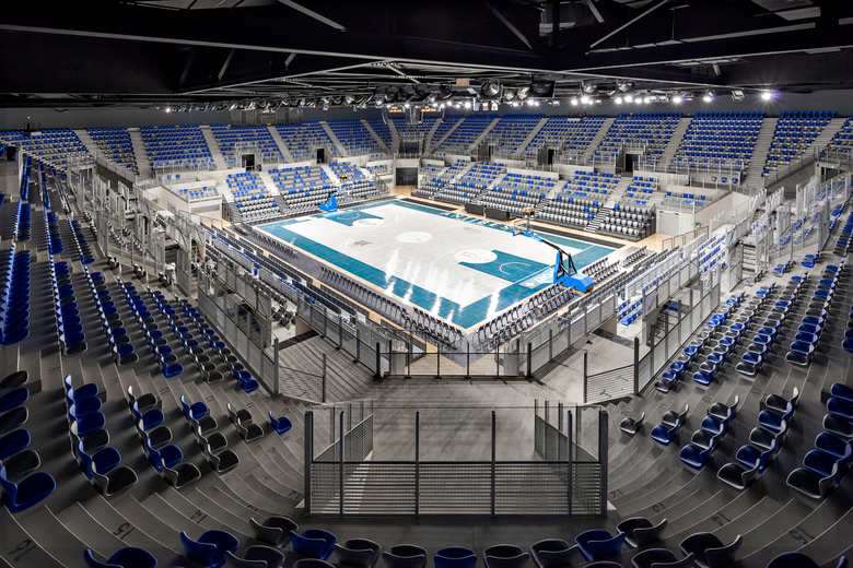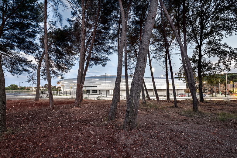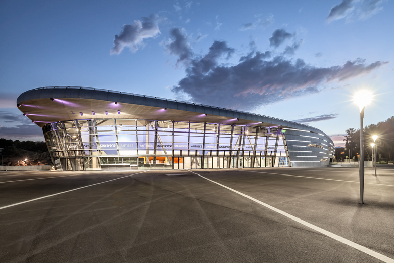 Die Multifunktionshalle liegt im Industriegebiet von Antibes. Die neue Arena markiert als zeichenhaftes Objekt die Schnittstelle zwischen Gewerbezone und Landschaftsraum und dient als ordnendes und identitätsstiftendes Element. Die durch den Straßenverlauf definierte dreieckige Form des Grundstücks bestimmt die Lage der beiden großen Raumvolumen, der Trampolinhalle und der Sportarena mit ihren Tribünen. Neben den Entwurf bestimmenden äußeren Faktoren, definieren interne Funktionsabläufe und räumliche Zuordnungen die Gebäudeform. Ein Tribünenring für 5000 Zuschauer, bildet den Kern des Gesamtkomplexes, alle Funktionen sind über zwei Hauptniveaus ringförmig darum angeordnet. Die zweite große Funktionseinheit stellt die im Nordosten angelagerte Trampolinhalle dar. Umschlossen sind die beiden Raumvolumen von einer gemeinsamen Hülle, die keine Unterscheidung der Himmelsrichtung vornimmt, was der dynamischen Formensprache der Halle entspricht. Horizontal gelagerte Bänder aus Streckmetall strukturieren die Oberfläche. Die Linierung, die sich aus diesen Bändern ergibt, ist das Hauptordnungsprinzip der Fassade und unterstützt das zentrale Thema der weichen, plastischen Übergänge bis in die Dachebene hinein.