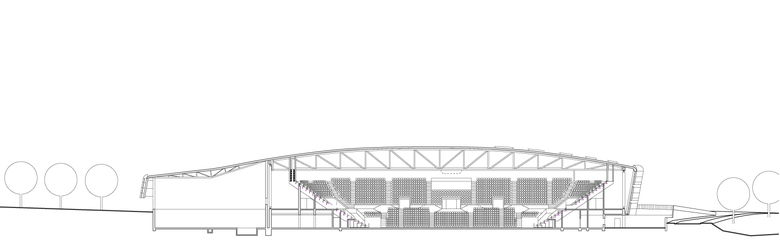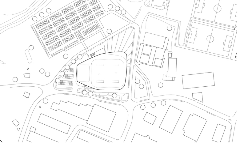 Das Erschließungsprinzip nutzt die unterschiedlichen Niveaus der Topographie, entzerrt so die Nutzungsströme und verbindet ringförmig alle Ebenen und Zugänge. Der Hauptzugang erfolgt von Osten über die obere Ebene: Die Zuschauer erreichen über die transparente Eingangshalle den umlaufenden Foyer-Ring. Dieser innere Umgang erschließt alle Serviceeinheiten und führt über die „Mundlöcher“ in die eigentliche Arena. Die Sportler erhalten ihren eigenen Zugang auf einem tiefer liegenden Niveau, wo auch die Zulieferung erfolgt. Die differenzierten Zugänge erlauben zudem größtmögliche Flexibilität und Parallelveranstaltungen.
