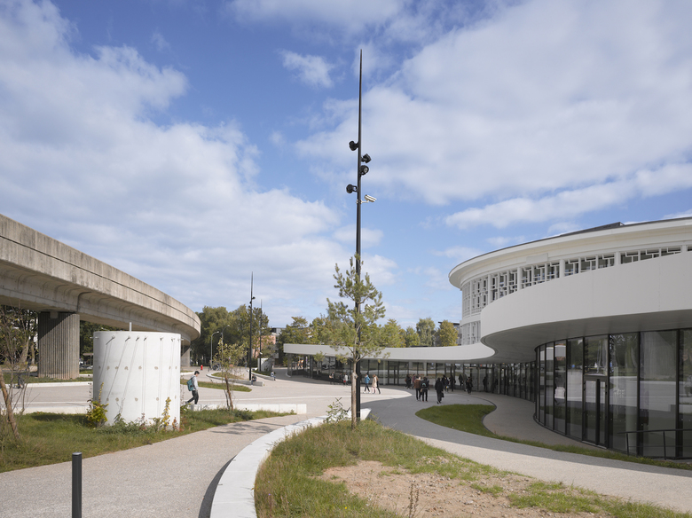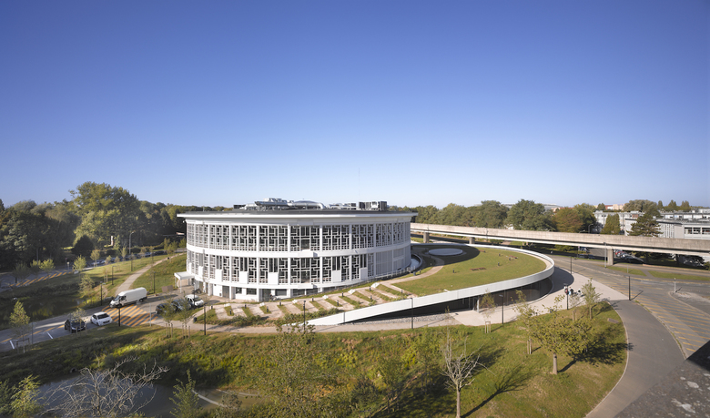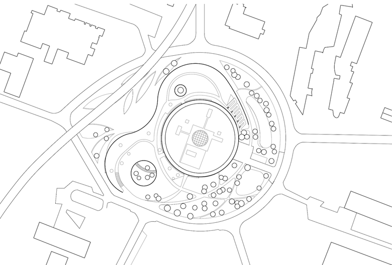 Das bestehende Bibliotheksgebäude mit seiner prägnanten, netzartig aufgelösten Betonfassade wird um einen Veranstaltungsbereich, eine Cafeteria und ein Experimentarium erweitert. Ein landschaftlich gestaltetes Plateau umfasst den Rundbau und setzt sich von diesem durch eine konzentrische Lichtfuge ab. Unter seinem geschwungenen Dach werden der neue Eingangsbereich und die Erweiterungsflächen angeordnet und über eine große, alle Geschosse umfassende Halle mit dem Bestandsgebäude verbunden. Aus der Bibliothek im klassischen Sinn wird ein modernes „Learning Center“.