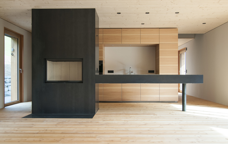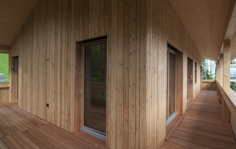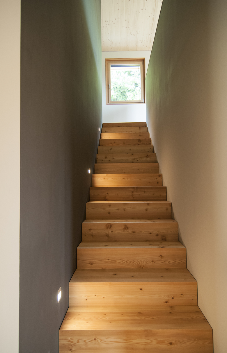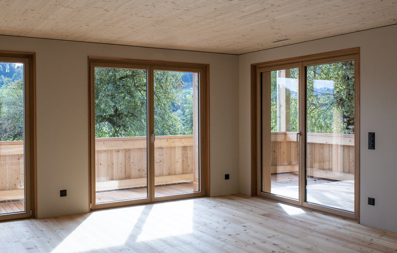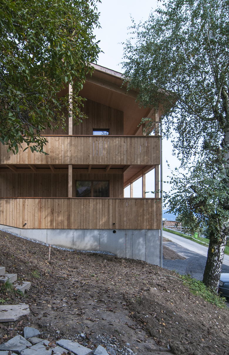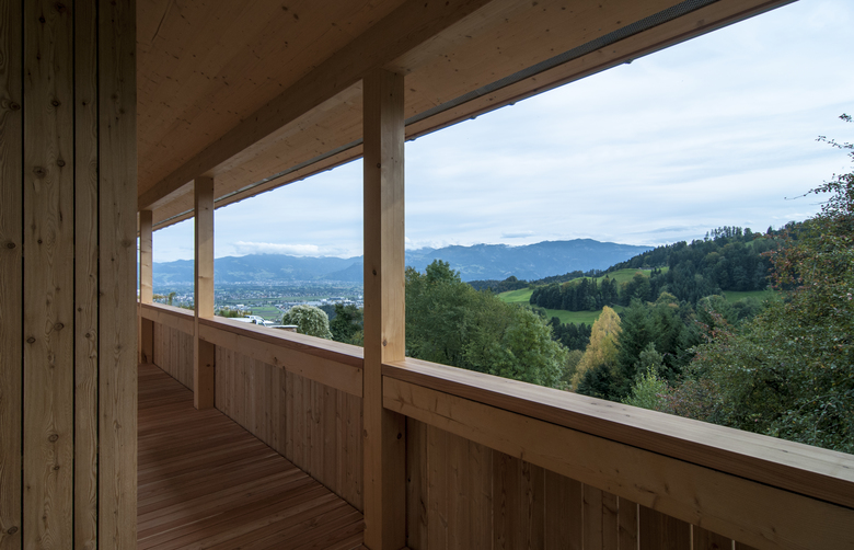 Einfamilienhaus mit toller Aussicht übers Rheintal im Weiler Sulzbach über Berneck. Die sägeraue Holzfassade passt sich in die Umgebung ein.