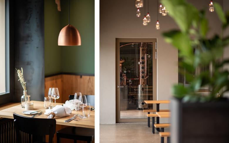 Im Saal, der Restaurant und Brauerei/Brennerei verbindet, kommt eine modernere flexible Möblierung zum Einsatz, die in der Materialität und in der Beleuchtung beide Bereiche kombiniert.
