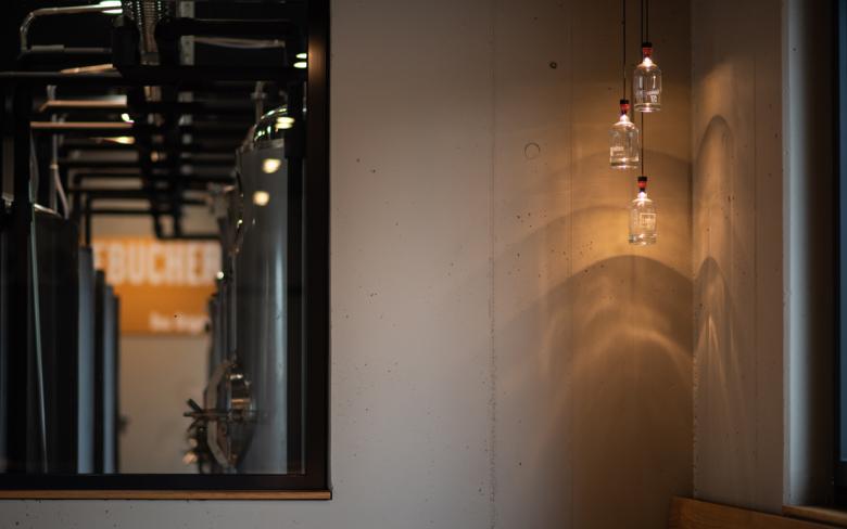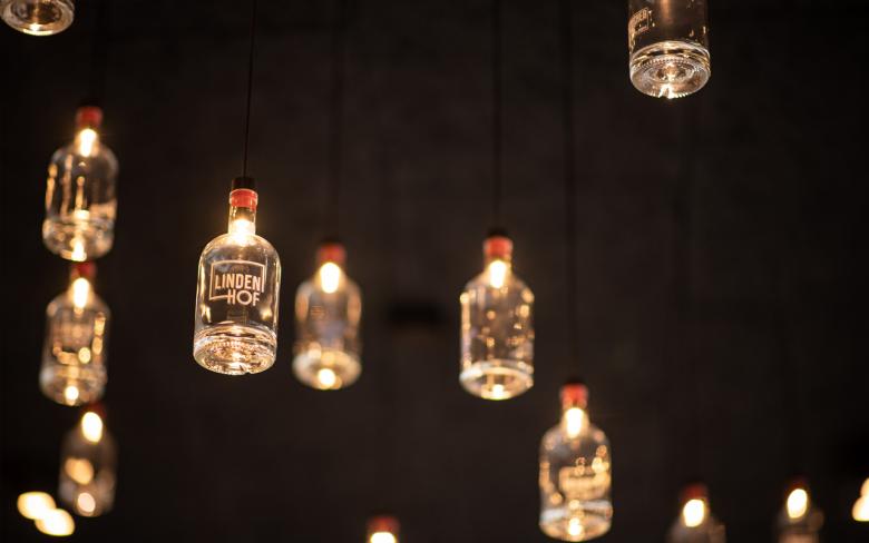 Das ehemalige Kurhaus auf dem Lindenhof-Arreal wurde durch eine spannende Symbiose verschiedener Unternhemen zu neuem Leben erweckt: Im renovierten und neu ergänzten Gebäude finden nun eine Brauerei, eine Brennerei, Wohnungen, ein Hotel und ein Restaurant Platz. Im gemütlichen Gastraum wurden Elemente der klassischen Raumgestaltung wie die Zweiteilung der Wände aufgegriffen. Moderne Rahmen aus Schwarzstahl fassen die Fenster ein. Viel Holz und eine angenehme Beleuchtung spielen zusammen mit einem dunklen Grünton. Die kupfernen Pendelleuchten erinnern an die Braukessel in der angrenzenden Brauerei.