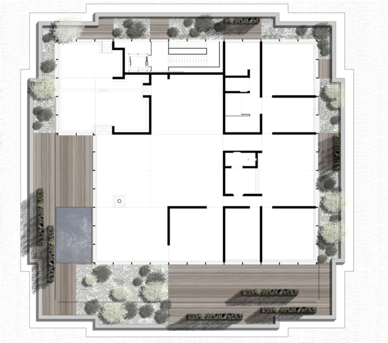 Die Gestaltung der Dachflächen sieht eine Fortführung der Räume des Penthouses in den Außenruam vor. Die Räume mit ihren spezifischen Nutzungen wie Lounge, Wohnzimmer, Badezimmer werden in den Außenraum fortgeführt. Die außenliegenden Wohnbereiche werden durch üppige Gärten begrenzt. Eine räumliche Gliederung der umlaufenden Freiflächen wird erzeugt. Semitransparente Paravents aus Hainbuchen nehmen die Fluchten der Fensterpanele auf und bilden die grünen Wände der Terrassen.