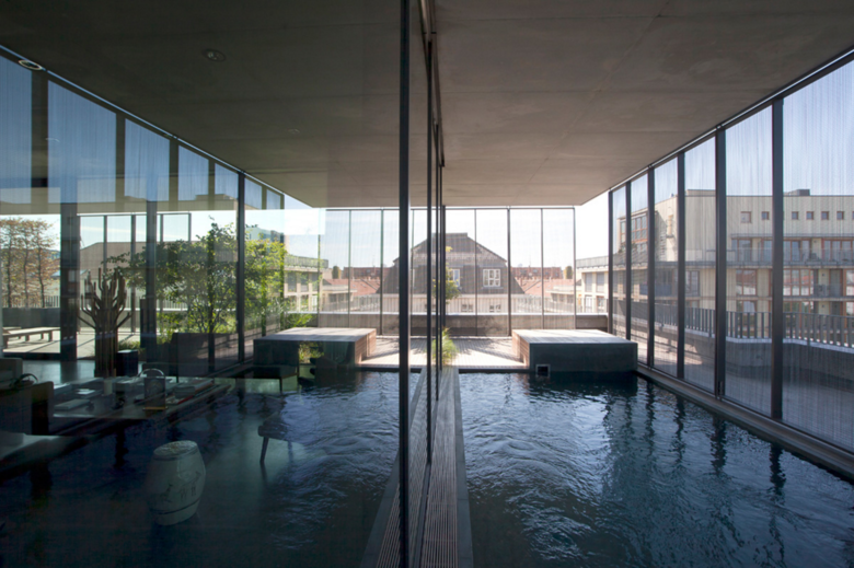 Dachterrassen – Die einzelnen Dachterrassen setzten die Lebens- und Funktionsbereiche der Räume des Penthouses in den Außenraum fort, so entstehen verschiedene Terrassen mit eigenständigen Funktionen, die Empfangsterrasse, die Gartenlounge, die Küchenterrasse, der Badezimmeraustritt, die Wisky & Cigarr Terrasse. Die Terrassen erhalten einen einheitlichen Belag aus Bangkirai. Die größte Terrasse, die Empfangsterrasse ist Südwest exponiert und erhält einen kleinen Swimmingpol, der als Wasserspiegel die Stimmung des Lichtes in die Wohnräume des offenen und großzügigen Penthouses transportiert. Semitransparente, grüne Paravents bilden analog der Wände des Penthauses introvertirte Terassenbereiche aus. Die Sichtschutzelemente nehmen dabei die Raumfluchten des Penthouses auf und führen sie an den Rand des Daches fort.