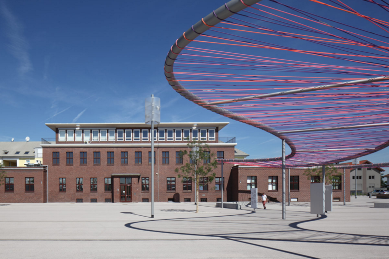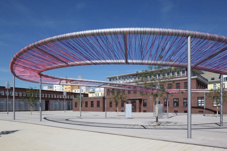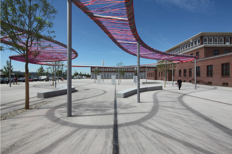 Der Platz erhält einen einheitlichen Belag aus Asphalt, der die industrielle Geschichte des Ortes widerspiegelt. Stahlbänder als Referenz an die kurzzeitige Nutzung als Waggonfabrik gliedern die Platzfläche. In freier Setzung locker über den Platz verteilte Schnurbäume (Sophora japonica) kontrastieren mit ihrem malerischen Wuchs die Strenge der Industriebauten und zaubern mit ihrem gefiederten Laub ein lockeres Spiel aus Licht und Schatten auf die Platzfläche und erzeugen dabei eine hohe Aufenthaltsqualität auf dem Platz.
