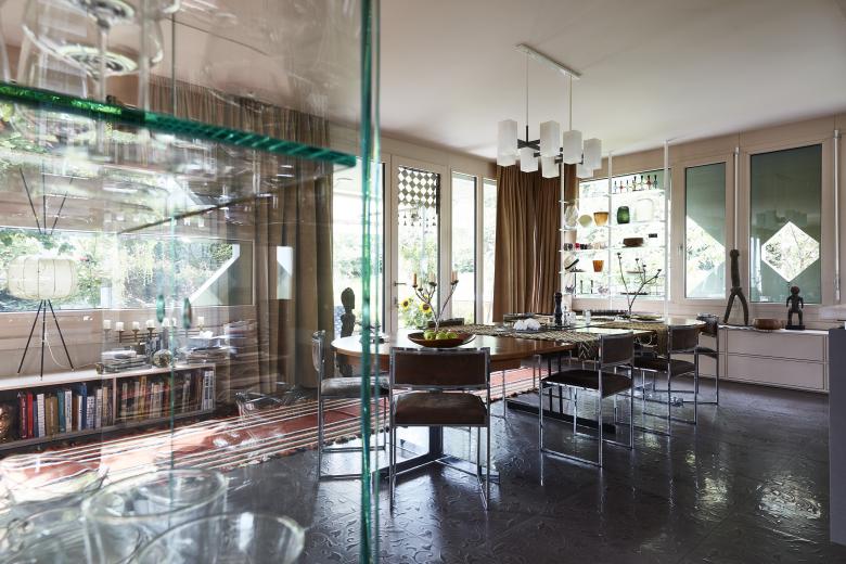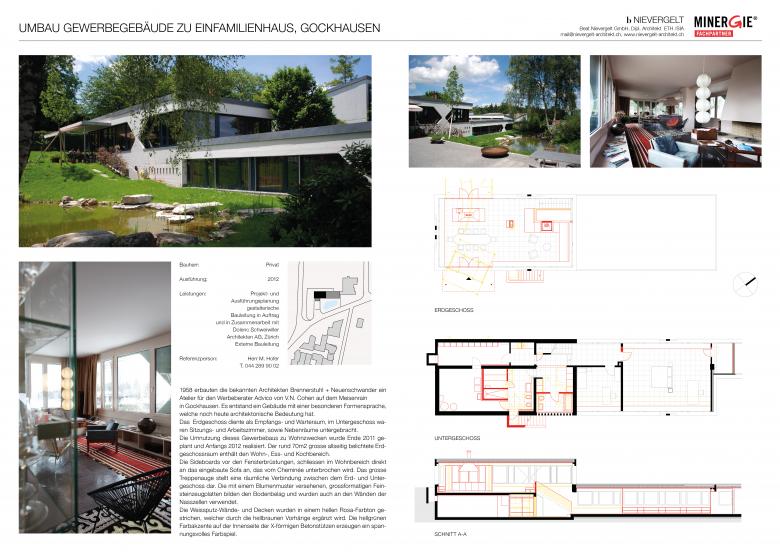 Die Umnutzung dieses Gewerbebaus zu Wohnzwecken wurde Ende 2011 geplant und Anfangs 2012 in Zusammenarbeit mit Dolenc Scheiwiller Architekten AG und Pasquale Baurealisation AG ausgeführt. Der rund 70m2 grosse allseitig belichtete Erdgeschossraum enthält den Wohn-, Ess- und Kochbereich. Die Sideboards vor den Fensterbrüstungen schliessen im Wohnbereich direkt an das eingebaute Sofa, das vom Cheminée unterbrochen wird. Das grosse Treppenauge stellt eine räumliche Verbindung zwischen dem Erd- und Untergeschoss dar. Auch die Schlafräume sind mit durchlaufenden Sideboards unterhalb der Bandfenster ausgestattet. Die mit einem Blumenmuster versehenen, grossformatigen Feinsteinzeugplatten bilden den Bodenbelag und wurden auch an den Wänden der Nasszellen verwendet. Die Weissputz-Wände- und Decken wurden in einem hellen Beige-Ton gestrichen, welcher durch die hellbraunen Vorhänge ergänzt wird. Die hellgrünen Farbaktente auf der Innenseite der X-förmigen Betonstützen erzeugen ein spannungsvolles Farbspiel.