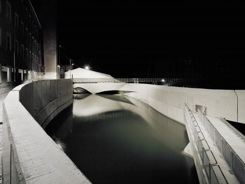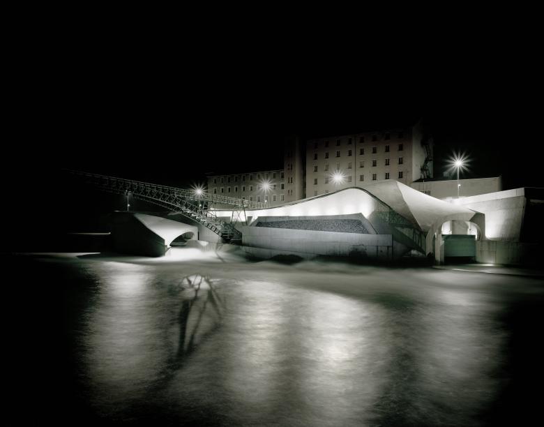 Unsere Konzeption sieht vor, die beiden Endpunkte Krafthaus (mit Generatoren und Transformator) und Staubalkenwehr (mit Rechenreinigungsanlage) mit einer durchgängigen Gebäudehülle zu verbinden, die ungefähr in der Mitte unter dem historischen Stahlfachwerk - Bogen des Kabelsteges hindurchtaucht. Dieses weich geformte Hüllvolumen bietet Raum für die vielfältigsten Assoziationen, die von `Welle` über `geschliffener Flußstein` bis `Gestandeter Wal` reichen können.