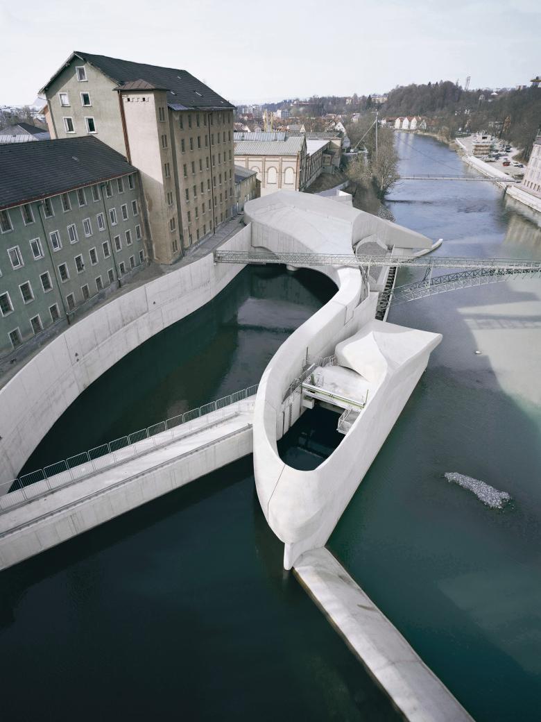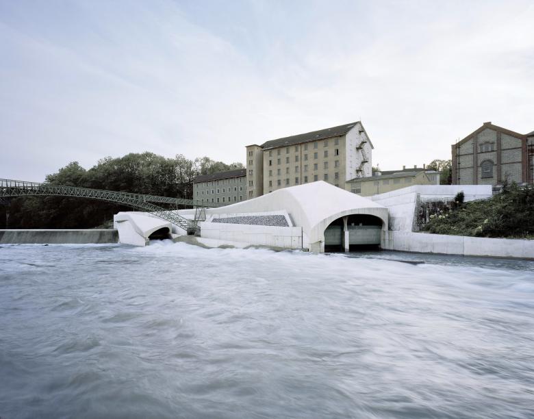 Das Bild ausgewaschener Gesteinsformationen im Fluss und die Übertragung der Wasserdynamik innerhalb des Kraftwerks in die Architektur haben die Formensprache maßgeblich bestimmt, zahlreiche Modelle halfen bei der Entwicklung, ehe die Gebäudehülle in ein 3-D - Datenmodell überführt wurde. Als Ergebnis entstand trotz der Gesamtgrösse, ein sehr differenziertes, organisches Gebilde, das sich einerseits an seine Umgebung angleicht, in seiner Ausformulierung jedoch als eigenständiges Bauwerk erfahren lässt.