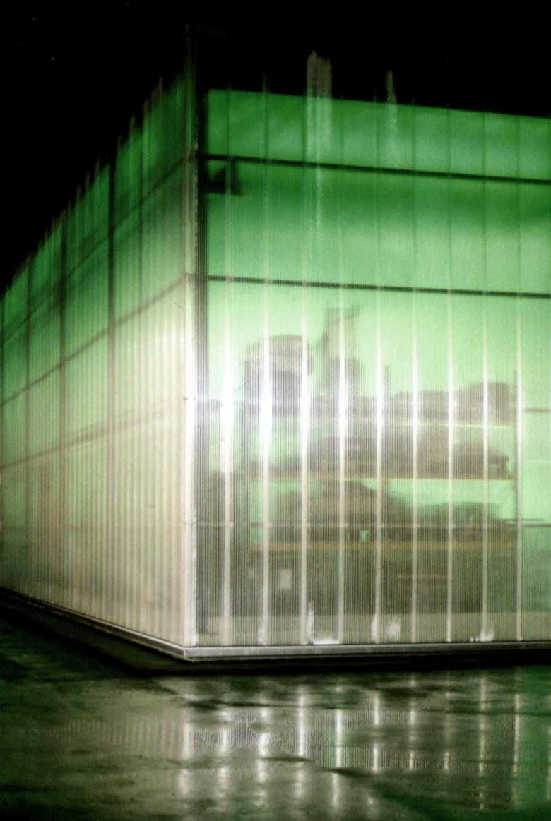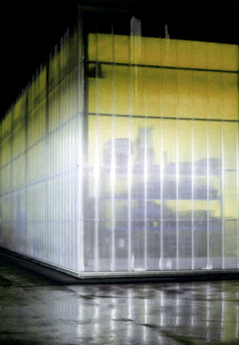 Die eigentliche Fertigungshalle mit ca. 1000 m2 Nutzfläche besteht aus einem kostengünstigen Stahltragwerk, das vierseitig mit Mehrfachstegplatten aus Polycarbonat umhüllt wurde – dem Wunsch der Nutzer folgend, eine helle, blendfreie Hallenatmosphäre zu schaffen. Die transluzente Außenhaut reagiert auf unterschiedliche Wetter- und Belichtungsverhältnisse und verleiht dem Gebäude ein opakes, geheimnisvolles Äußeres, das die Firmenphilosophie unterstützt. Besonders in den Abend- und Nachtstunden fungiert der hinterleuchtete Baukörper quasi in seiner Gesamtheit als Werbe- und Imageträger. Mittlerweile wurde auch eine dynamische Lichtführung mittels sog. RGB – Licht installiert, wodurch weiche Farbverläufe generiert und zeitlich aufeinander abgestimmte Farbsequenzen auf die Innenfassade projiziert werden können. Die Komposition orientiert sich an den vier Jahreszeiten mit den Schwer-punktfarben Blau (Winter), Grün (Frühjahr), Rot (Sommer) und Gelb (Herbst) und sorgt auf diese Weise im über-tragenen Sinne für eine Rekultivierung des kontaminierten Ortes inmitten einer landschaftlich intakten Umgebung.