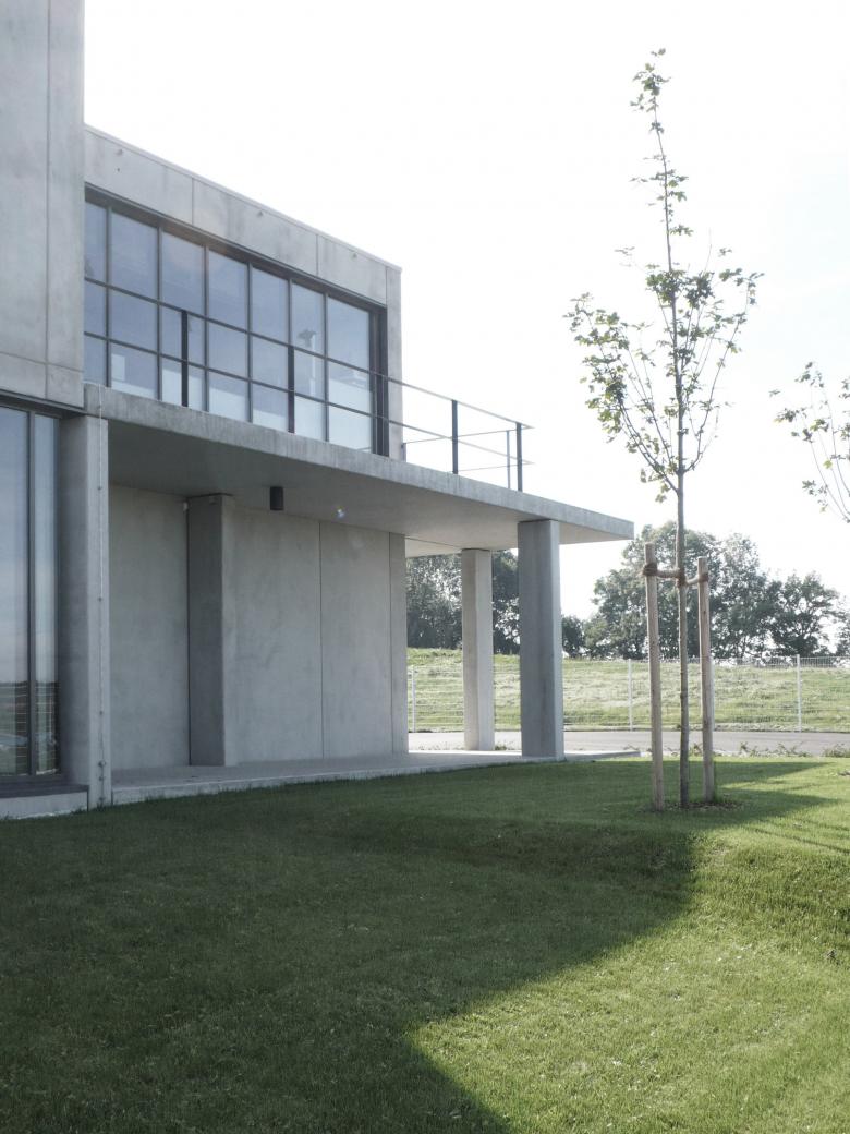 Die plastische Baukörperformulierung mit Vor- und Rücksprüngen trägt zum kleinteiligen Erscheinungsbild ebenso bei wie der differenzierte Diagonalrythmus zwischen verglasten und geschlossenen Fassadenflächen bei den Längsansichten. Während sich die `Spuren` mit der Topographie verzahnen, fließt das Gelände praktisch natürlich durch die Hallenbereiche hindurch. Die monolithische Materialisierung aus kerngedämmten Stahlbetonfertigteilen lässt das Gesamtensemble wie einen Findling in der Landschaft erscheinen.
