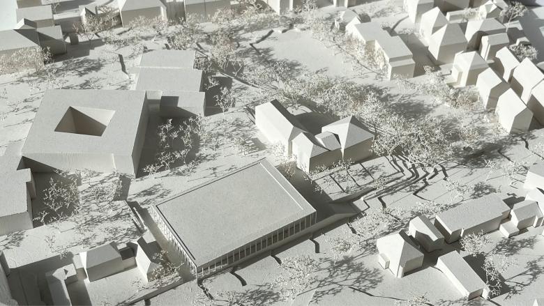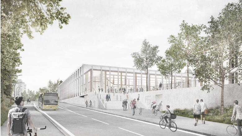 Die Stellung im Stadtraum | Aufgrund ihres Selbstverständnisses als öffentlicher Baukörper positioniert sich die Sport- halle, auf einem Sockel liegend, selbstbewusst im Straßenraum der Lindauer Straße. Da- durch wird sowohl eine Präsenz im Stadtraum erzeugt, als auch die Lesbarkeit der da- hinterliegenden Struktur, der Schule, vom Straßenraum aus gestärkt. Außenräumlich wird eine wechselseitige Adressbildung zwischen Schule und Stadt- baukörper, innenräumlich eine Blickbeziehung zum städtischen Raum, ein „Fenster zur Stadt“, erreicht. Um diesen deutlichen Mehrwert zu generieren, wird von der in der Aus- lobung geforderten Position im Grünraum zwischen Lindauer- und Reichlinstraße Abstand genommen. Vielmehr werden die Großbaumassen, die als schwimmende Baukörper in einem übergeordneten Parkraumkonzept definiert werden, gezielt in Beziehung zueinander gesetzt. Eine Abfolge dreier topografisch gestaffelter Hofräume entsteht, die in den bestehenden östlichen Grünraum münden. Dieser wird in Folge als naturnaher Parkraum, sowohl für die Bevölkerung, als auch für die Schule, ebenfalls als öffentlicher Raum aufgefasst, zu- gänglich gemacht und aktiviert. Ein deutlicher Mehrwert für die umliegenden Bewohner, aber auch für die ganze Stadt entsteht.