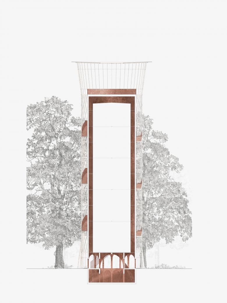 Aufgrund seines Selbstverständnisses als Teil des Parkraums bezieht sich der Wasserturm in seiner Ausformulierung auf die Struktur eines baumes. Ein Aufgeständerter Kern aus monolithischem, brettergeschalten Dämmbeton bildet die Grundstruktur, an die ein sich verzahnendes Flachstahlgeflecht angehängt wird. Dieses dient gleichzeitig als Auflager für die Stahlwangentreppen sowie für das Dach der Aussichtsterrasse. Dabei schafft der Betonkörper eine Analogie zur Dichte des Blattwerks. Zusätzlich spielt die eigene, rote Tonalität des Bauwerks mit den jahreszeitlich wechselnden Farbigkeiten der umliegenden Bäume. Die erdgeschossige Aufständerung samt Verglasung dient einerseits dem Einblick in die Wassertechnik, andererseits erzeugt sie eine Verwandtschaft zur Erscheinung einer Baumgruppe mit ihrer Durchlässigkeit unterhalb des Astansatzes. Das Flachstahlgeflecht mit zahlreichen gesteckten Verzweigungspunkten hingegen übersetzt abstrakt das Bild von Aststrukturen.