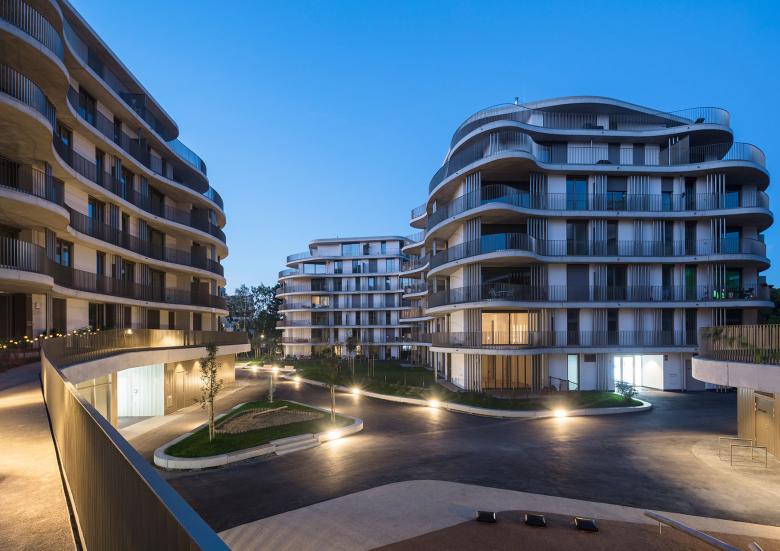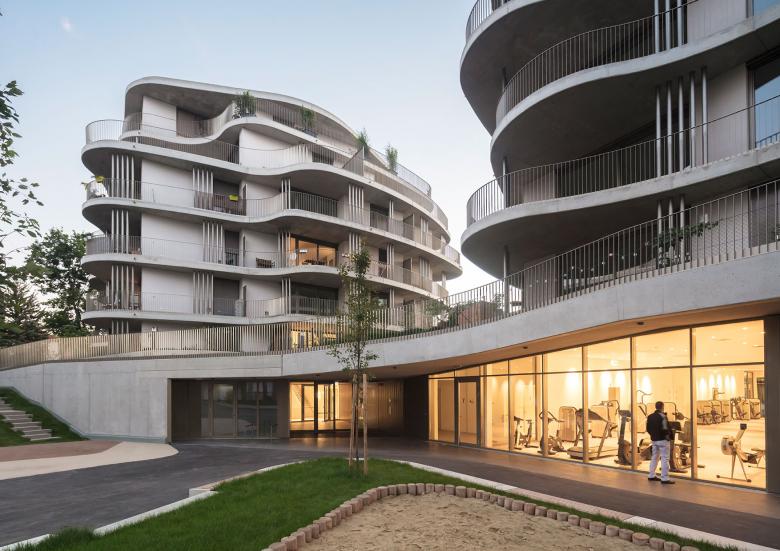 Aufgrund der freien Form der Häuser, sowie der Variation in Geschoßzahl und der Höhenniveaus bieten die Wohnbauten eine enorme Vielfalt bei gleicher Grundstruktur und ökonomischer Bauweise. Hervorzuheben ist das breite Angebot differenzierter Grundrisstypen. Die umlaufenden Balkone verleihen den Baukörpern Leichtigkeit, und lassen die Grenzen des Gebäudes verschwimmen. Gleichzeitig erzeugen sie Außenräume in West-Süd-Ost-Ausrichtung und schaffen Privatheit gegenüber Nachbarn.