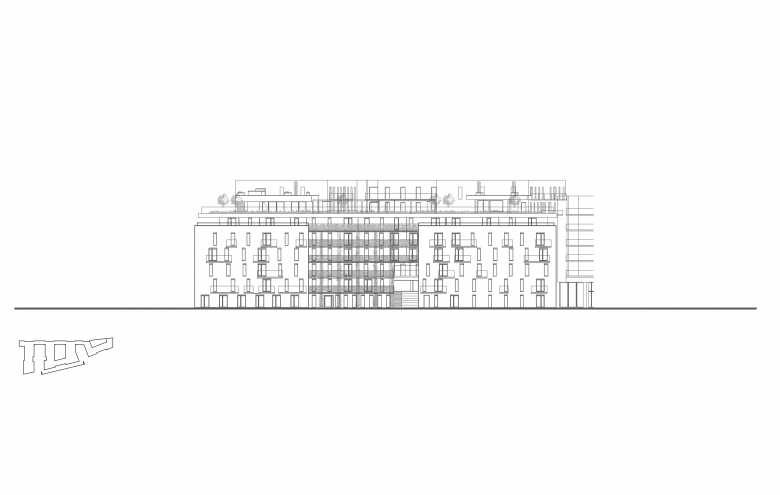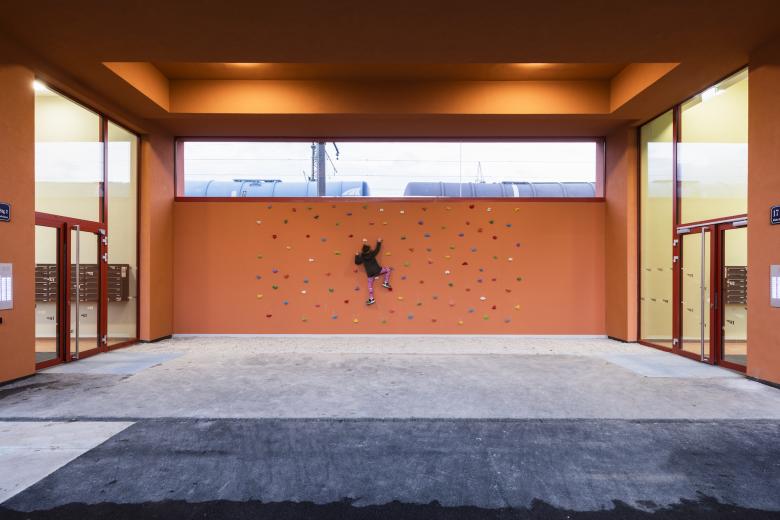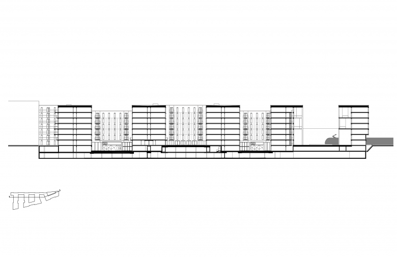 Der Höhenunterschied zum Bahngelände im Norden ist prägend für das Projekt. Der Widmung entsprechend stufen sich die Baukörper vom höheren Bahnniveau ausgehend, absteigend nach Süden und zur bestehenden Wohnbebauung ab. Als Folge sind alle Wohnungen ausschließlich nach Süden, Westen und Osten ausgerichtet.