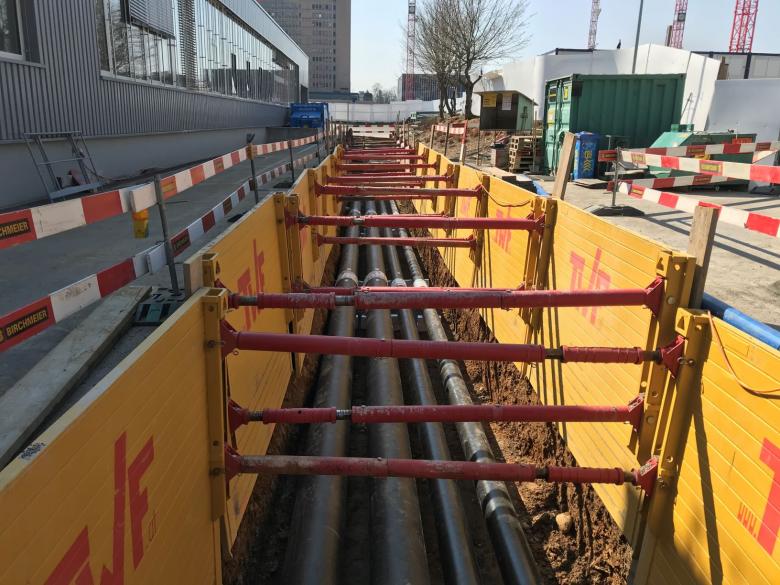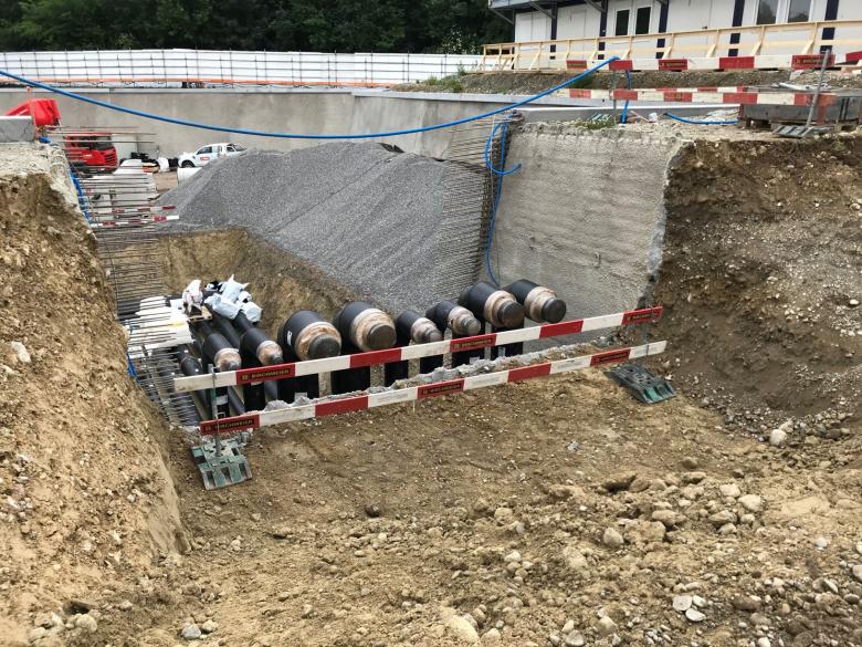 Der gespriesste Grabenbau für das Fernwärmetrasse bestehend aus 8 Rohren mit Aussendruchmesser zwischen 25-45cm welches zweilagig verlegt wird erstreckt sich auf eine Länge von zirka 160m. Dazu wird noch ein Hausanschluss für das bestehende Gebäude Wäscherei erstellt. Teilweise waren die Gräben in rund 3.5m tief. Bestehende Leitungen und unterirdische Kanäle mussten mit der zu wählenden Linienführung berücksichtigt werden.