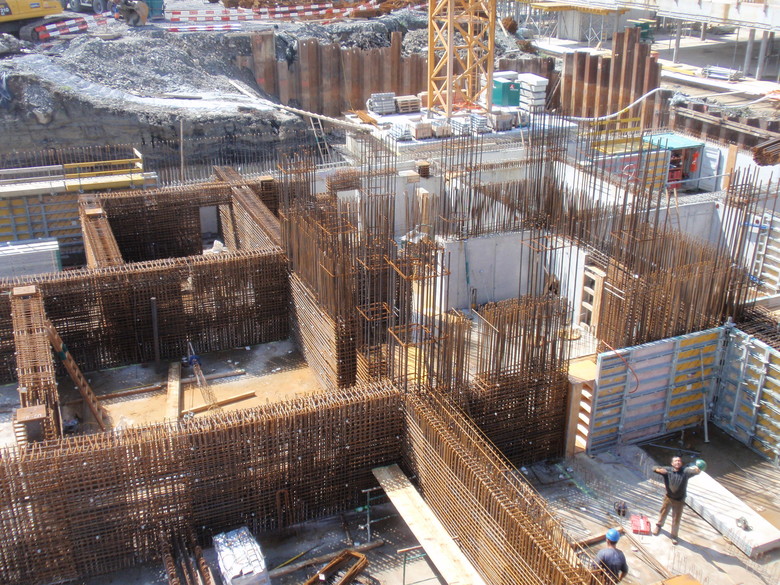 Im 2. UG verteilen 80cm dicke Wände die Lasten auf jeweils 42 Bohrpfähle. Diese sind 5 bis 35m lang und weisen Durchmessern von 1.2m und 1.5m auf. Dank der idealen Anordnung der Pfähle und der Kernwände, wird nur eine 50cm dicke Bodenplatte benötigt. Das ganze UG (Bodenplatte, Wände, Decke) wirkt als steifer Kasten und damit als massive "Bodenplatte".