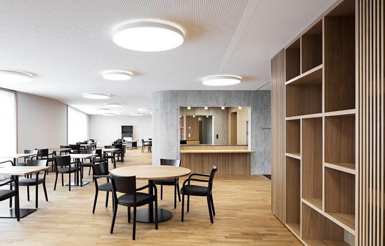 Die Demenzwohngruppe im 1. Obergeschoss verfügt über einen Demenzgarten in Form einer Dachterrasse. Die grosse Gebäudetiefe wird in ihrer Mitte durch einen Lichthof durchstossen. Die zwei Pflegewohngruppen pro Geschoss entsprechen, mit ihrem gespiegelten Layout, einer zeitgemssen Konzeption einer Pflegewohngruppe.