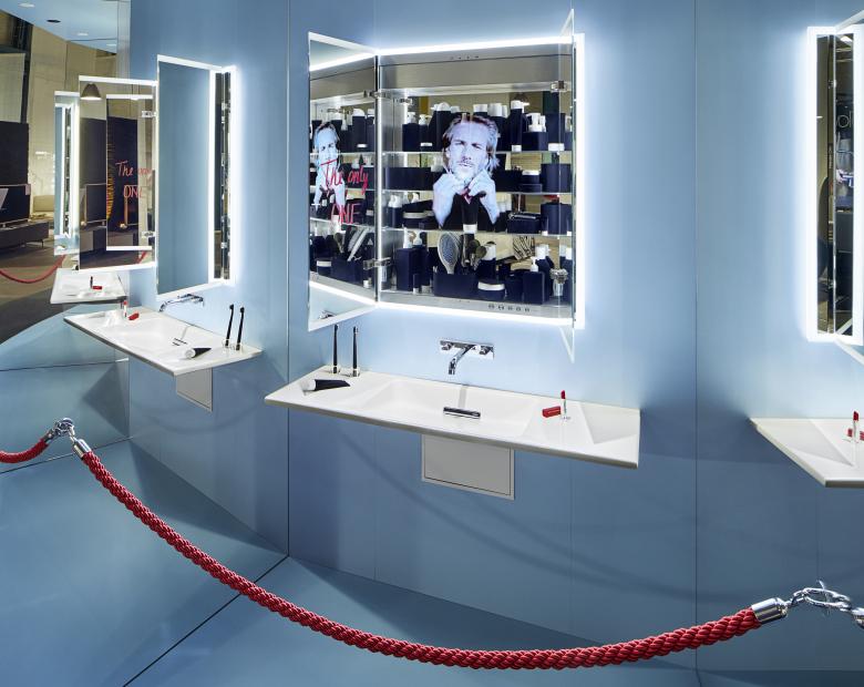 Die Antwort liefert Bureau Hindermann mit einer multimedialen Installation aus Spiegelschrank und Waschtisch. Schrägstehende Spiegel lassen ein optisches Karussell entstehen, und ein LED-Rotor zaubert vor dem geöffneten Schrank eine 3D-Animation.