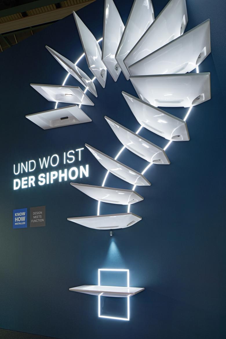 «Und wo ist der Siphon?» Bureau Hindermann weckt mit dem Stand auf kleinster Fläche die Neugierde für die vollintegrierte Lösung für das Bad Geberit ONE, die am Hauptstand präsentiert wird.