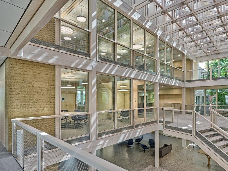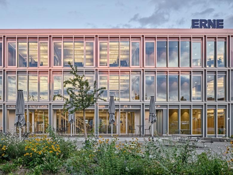Das stark wachsende Unternehmen Erne AG Holzbau verdoppelte in nur zehn Jahren die Anzahl der Mitarbeitenden auf 330. Um aktuellem und künftigem Platzbedarf sowie zeitgemässen Organisationsformen gerecht zu werden, investierte das Holzbauunternehmen in einen Büroneubau am Standort Stein. Unter Einbezug des bestehenden Modulbaus entstand ein neues räumliches Ganzes mit Innenhof, in dem sich offene Raumsequenzen mit den Raummodulen des Bestandes zu einer flexiblen Bürowelt ergänzen. Dabei bildet die horizontale Erschliessungsfigur zusammen mit den zentral im Atrium liegenden Treppen und Verbindungsbrücken ein Kontinuum, welches die vertikale Verbindung zum im Erdgeschoss liegenden «Marktplatz» schafft.