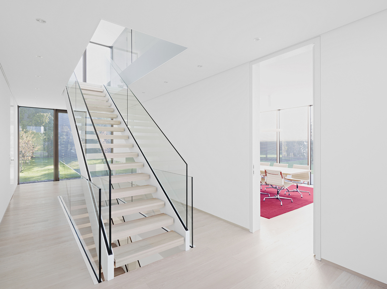 Das Innere des Wohnhauses ist durch eine klare Führung von Blick- und Bewegungsachsen bestimmt. Im Zentrum des Gebäudes befindet sich die Eingangshalle mit zentral gestellter Treppe.