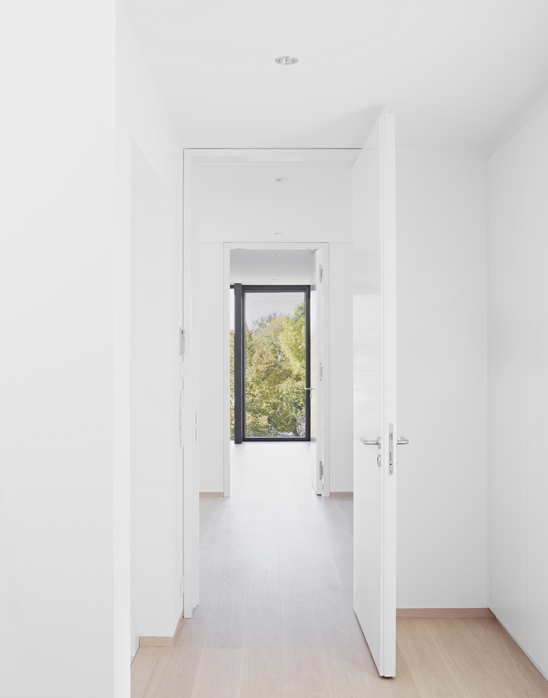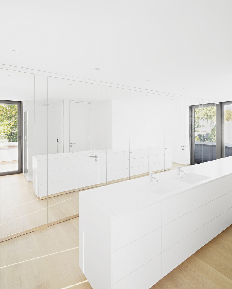 Seitlich zur Halle gelegen befinden sich die Wohnräume. Im Staffelgeschoss ist der Schlafbereich mit offenem Badezimmer und Ankleide untergebracht. Das Staffelgeschoss wird über eine separate halbgewendelte Treppe erschlossen, wodurch dieser Bereich als „Haus im Haus“ erlebt wird und eine hohe Intimität erhält. Auch im Inneren des Staffelgeschosses wird das Thema der spiegelnden Flächen konsequent weitergeführt. Durch vollflächige Verspiegelungen der Schrank- und Zimmertüren erscheinen die Räume großzügig und weit.
