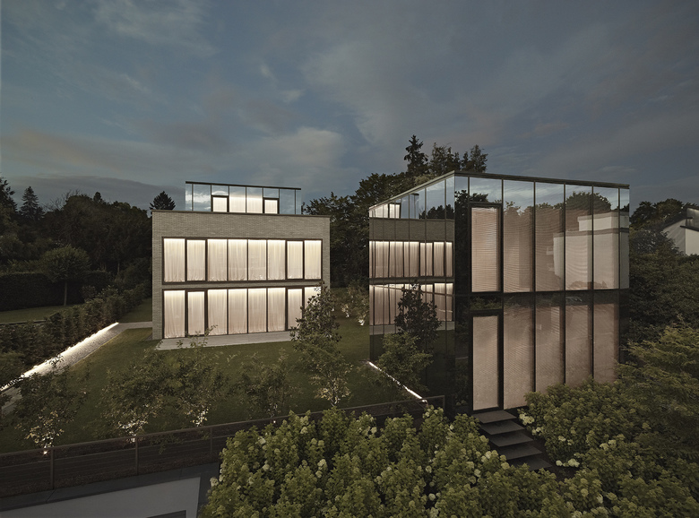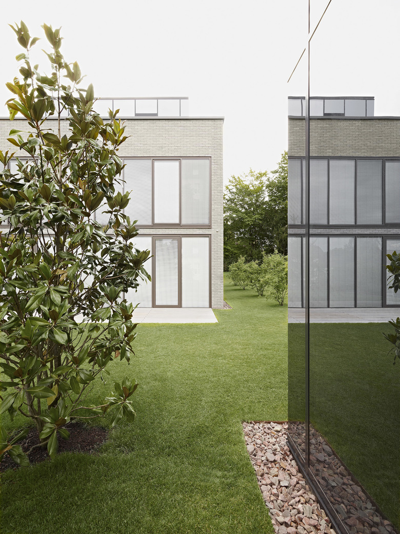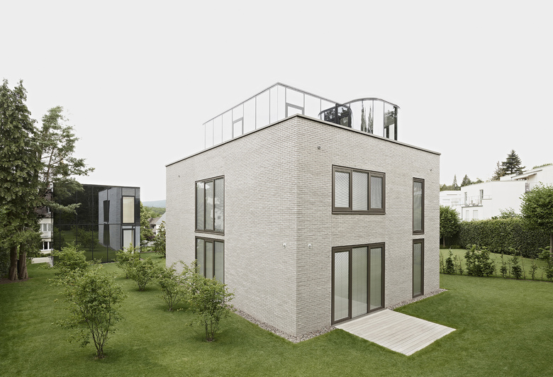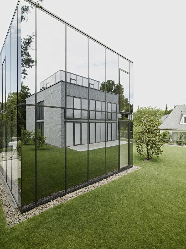 Das Wohnhaus hat eine Fassade aus gedämpften grauen Backsteinen, und der Pavillon ist vollflächig verspiegelt. Der markante Glaswürfel nimmt das wechselnde Licht des Himmels und seiner Umgebung auf. Je nach Blickwinkel, Tageszeit und Witterung verändert er seine Erscheinung, und seine Fassade reagiert auf ihre Umgebung. Ebenso wie das verspiegelte Staffelgeschoss auf dem Wohnhaus, welches durch Reflexion mit dem Himmel verschmilzt.