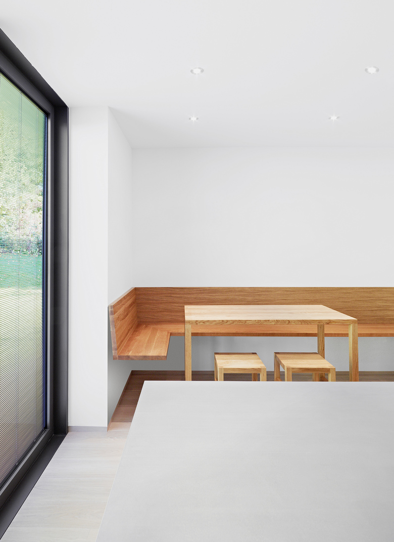 Das Grundstück steigt von der angrenzenden Straße 3 Meter an und bildet ein Gartenplateau, auf welchem die Baukörper platziert wurden. Durch die Stellung der Gebäude zueinander werden auf dem Plateau die Außenräume gegliedert und klare Raumkanten definiert.