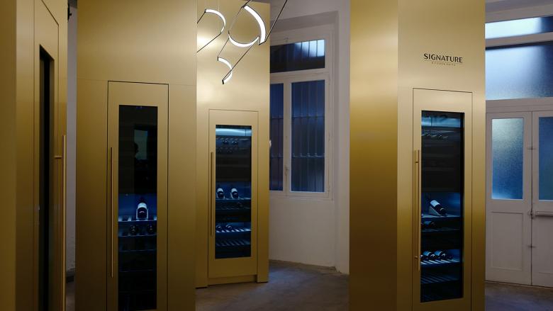 Elemente wie goldene Hervorhebungen, Spiegel und eine sinnliche und minimalistische Designsprache, legen die Betonung auf das Produkt und visualisieren die Technologie und Philosophie der Marke. Auch der starke Kontrast zum einrahmenden Gebäude sorgt dafür, dass die Küche zu einem echten Blickfang wird.