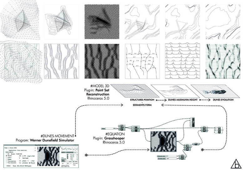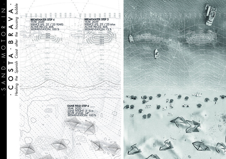 "During the Spanish housing bubble, the 30% of the beachfront was urbanised. This project is a manual to regenerate these lost landscapes: starting from deconstruction, up to the aerodynamic design of sand catcher devices, it aims to build a coexistence space between tourism and nature"
