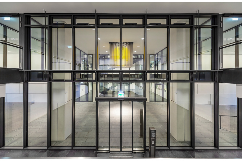 Die Lichtgestaltung bezieht sich auf den groß dimensionierten Gebäudedurchgang sowie auf die beiden Teile der Eingangshalle und schafft es, durch die intensiven Wandaufhellungen die Transparenz der Foyer-Verglasungen zu erhalten und somit den geteilten Raum als Ganzes erfahrbar zu machen.