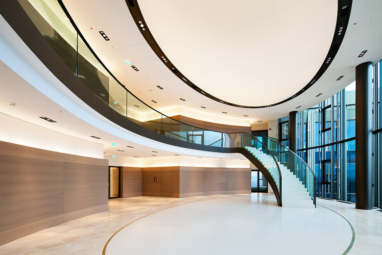 Eine dynamische Steuerung verleiht dem Gebäude einen einzigartigen Charakter durch dezente Wellenbewegungen. Für ein harmonisches Zusammenspiel von Tageslicht und Kunstlicht besteht die Allgemeinbeleuchtung hauptsächlich aus einer ausgeglichenen Kombination diffuser und brillanter Beleuchtung. Für die meisten Bereiche werden energieeffiziente Leuchten mit Hochdruckentladungs- oder Leuchtstofflampen verwendet. Lediglich hochwertige Besprechungsräume, das Kasino und Coffee-Spots werden mit Halogenstrahlern ergänzt, um eine exzellente Farbwiedergabe und Brillanz zu gewährleisten.