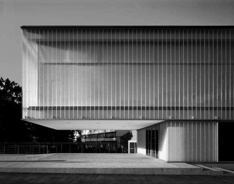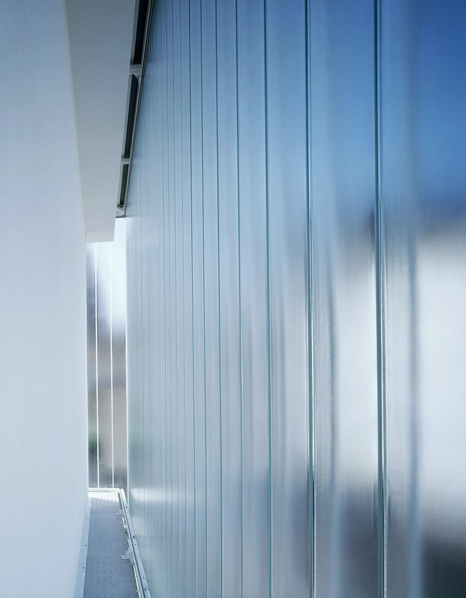Licht gefiltert, Licht geschichtet – Komplementär zur Tragstruktur umhüllen die verschiedenen, lichtdürchlässigen und lichtfilternden Schichten der Gebäudehülle das Museum. Das Licht kann im Gebäudeinneren durch diese transluziden Schichten dosiert und „domestiziert“ werden. Die äussereste Fassadenhülle besteht aus selbstragenden Linit®-Profilgläsern, die mittlere aus einem textilen Sonnenschutz, die innere aus geäzten Isolierglaselementen. Die äussere Fassadenhülle bildet im Obergeschoss einen 60cm breiten, begehbaren Zwischen-Raum, der als zusätzlicher Ausstellungsraum dient. Im Eingangsbereich und im Bereich des kleinen Innenhofes im Obergeschoss sind die Gläser klar, und erlauben so den Bezug zur Aussenwelt.