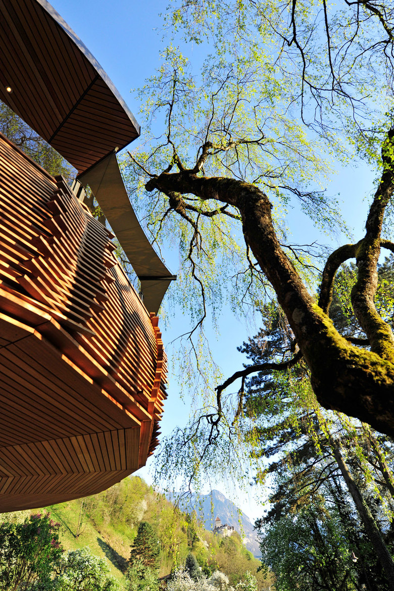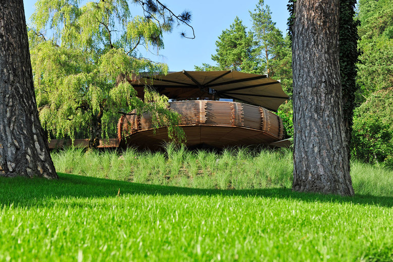 Das Gesamtkonzept sieht vor, das Hotel in den großen Park an seiner Hanglage, mit verschiedenen Ebenen, Räumen und Elementen einzubinden. Die Bäume und Strukturen des bestehenden, klassisch angelegten Parks werden weitestgehend erhalten aber neu vernetzt um heutigen, modernen Ansprüchen zu genügen. Eine neu konzeptionierte und für verschiedene Nutzungen ausgelegte Gastronomiefläche verbindet auf elegante Weise den Hotel und Restaurant Empfang über einen einladenden schattenspendenden Bereich mit der südseitigen Sonnenterrasse am Hang. Beim Spazieren durch ein bestehendes Birkenwäldchen, unterpflanzt mit sanften Wellen aus Farnen und Hortensien, erschließt sich dem Gast der eigentliche Park. Am plätschernden Brunnenplatz umschlossen von einem Bogen aus duftendem Flieder, erhebt sich dann das Adlernest. Dieses wird wohl das wichtigste neue Element des Parkhotel Sonnenhof sein. Symbolisiert der Adler doch seit langem schon die Sonne und die Herrscher dieser Welt, inspirierte er auch die Landschaftsarchitekten, hier etwas Besonderes zu kreieren.