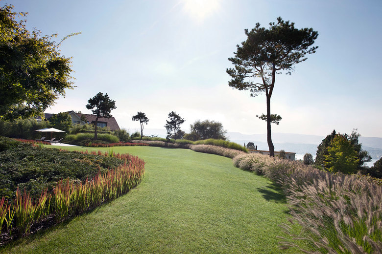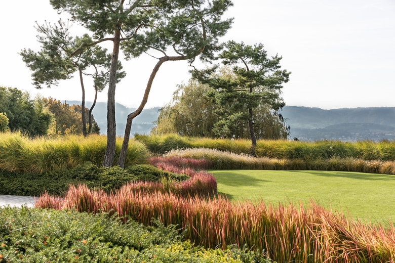 Ein Gefühl von Gemütlichkeit war der größte Wunsch des Kunden, und der Garten erfüllt diesen Aspekt in moderner Form. Malerische, knorrige Pinien und grosszügige Rasenflächen verleihen das Gefühl von Stabilität und Endlosigkeit im Garten.