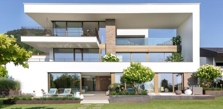Das Exterior ist maßgeblich geprägt von der großflächigen Öffnung der Südseite. Horizontale Bänder, abwechselnd in weißem Putz und dunklem Aluminium, halten die drei Ebenen optisch zusammen und lassen das Haus trotz kubistischer Formgebung aus allen Blickwinkeln leicht und elegant wirken.