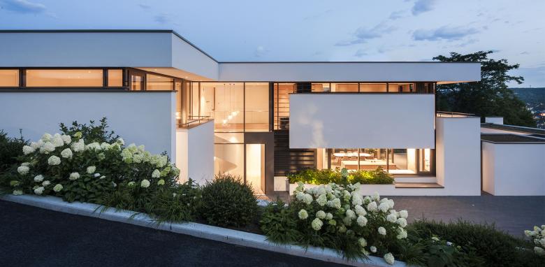 Das war nämlich der zweite Wunsch des Hausherrn und seiner Ehefrau. Ihr Haus möge dem Grundstück über dem Stadtkern von Esslingen Respekt erweisen und trotzdem Eleganz, Offenheit und Selbstbewusstsein demonstrieren. Es schmiegt sich flach in den Südhang; nichts stellt sich dem Passanten auf der Straße optisch in den Weg – aber vom talseits gelegenen Freisitz mit dem kleinen Ahornbaum in seiner Mitte, vom Wohn- und dem Essbereich und aus dem Home Office geht der Blick aus Panoramafenstern weit über die Stadt mit ihren stolzen Türmen und den mittelalterlichen Fachwerkhäusern bis auf den Wald und die Berge gegenüber.