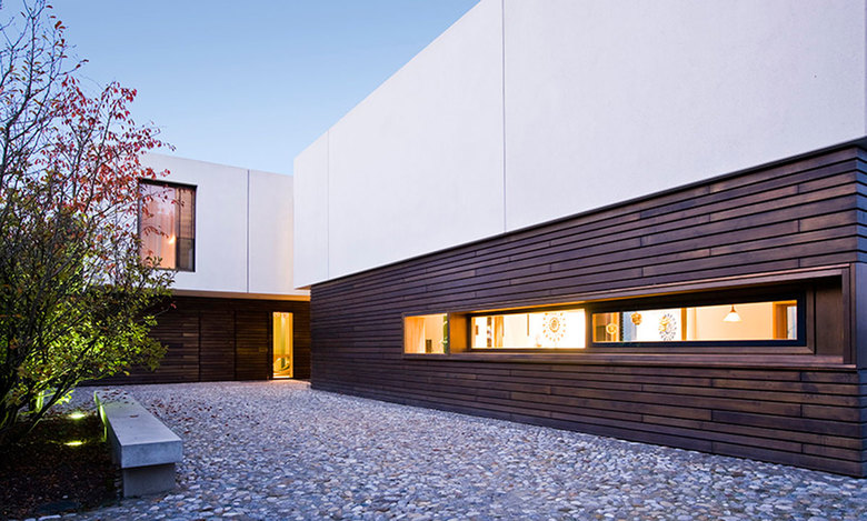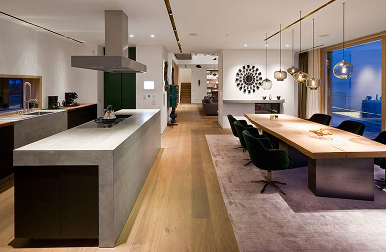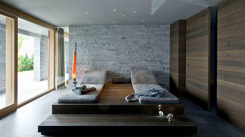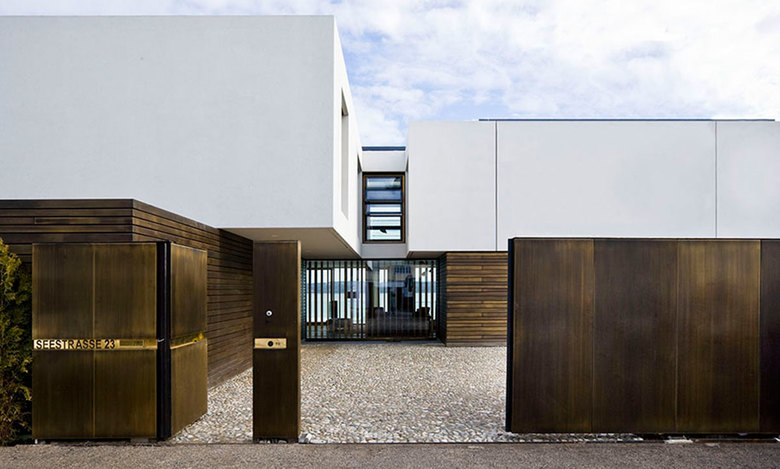 Im Inneren galt als Maxime an jedem Ort im Haus Erholung, Ruhe und Entspannung zu ermöglichen. Die grosszügigen Wohnbereiche von EG und OG sind durch einen Luftraum miteinander verbunden. Im Eingangsbereich schafft ein Wasserbecken mit Lichthof und Wasserfall die Verbindung vom Aussenraum zum Wellnessbereich im UG. Der Seeblick durch eine vertikale Glasfuge ist ein weiteres Highlight des intimen Innenhofes.