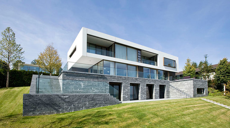Städtebaulich wurden die Ideen in enger Zusammenarbeit mit der Gemeinde Schondorf ausgearbeitet. Das Gebäude übernimmt die Lage des Vorgängerbaus auf dem Grundstück. Zur Strasse und den Nachbarn wird grosszügig Abstand gehalten. Drei deutlich differenzierte Ebenen bilden den Baukörper. Lediglich auf der Seeseite treten die Steinvolumen in Erscheinung - das UG ist in den Hang eingebettet. Strassenseitig nimmt der Betrachter zuerst den geschlossenen Kubus des OG wahr, der die intimen Wohnräume beinhaltet. Das EG bildet eine horizontale Fuge, die leicht zwischen den soliden Geschossen liegt. Aus der Lage des Grundstücks folgt die Anordnung der Öffnungen: wenige kleine Fenster zur Strasse hin und grosse Fensterflächen zum See orientiert. Das kompakte Volumen des OG kragt scheinbar schwebend, weit über dem verglasten EG aus.