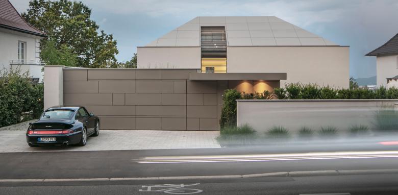 Radikal transparent zum Hang, vornehm geschlossen zur Straße. Erst nach dem Eintreten gibt der geometrische, fast unscheinbar wirkende Baukörper den atemberaubenden Blick über die Stadt frei. Das schlichte Äußere ist geprägt von der Neuinterpretation des klassischen Walmdaches, das anstelle von klassischen Dachziegeln mit großformatigen Alu-Platten überzogen ist und Ton-in-Ton in die Fassade übergeht. Einfriedung und Garagenbau dienen als Sichtschutz und greifen die Ästhetik wieder auf. Ein markanter Schlitz im Zugangsbereich gibt einen Vorgeschmack auf die gläserne Panorama-Rückfront.