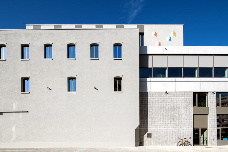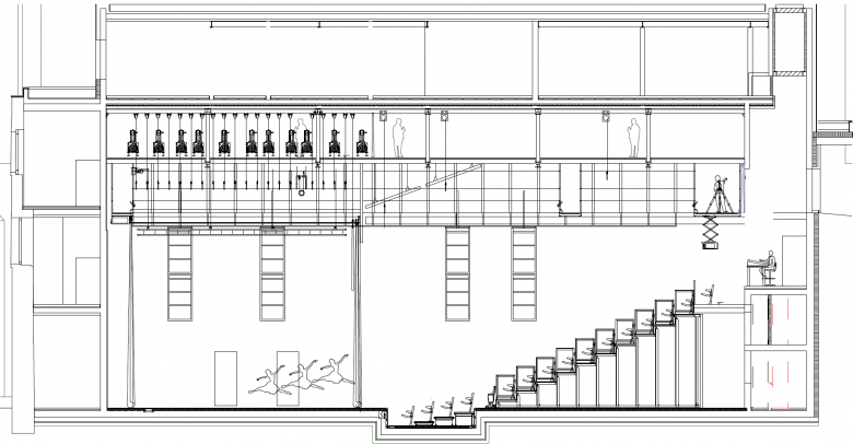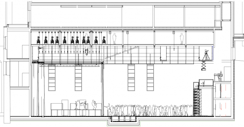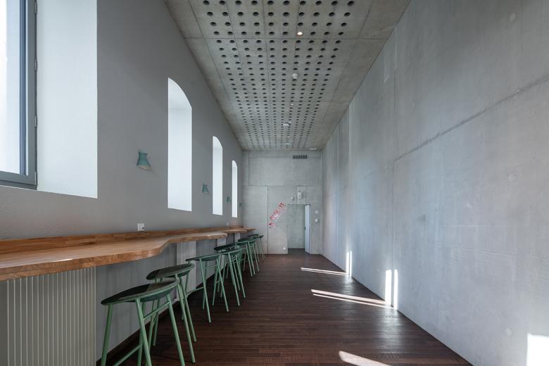 Das neue Jurassische Kantonstheater verknüpft die Überbauung mit der auf der Hügelkuppe gelegenen Altstadt. Es wird als kompakter Baukörper in die bestehende Topografie und hinter die erhaltene Fassade der alten Brauerei eingepasst. Der Publikumseingang erfolgt über die hangseitige Route de Bâle und den neuen Theaterplatz. Die dreiseitig verglaste Eingangshalle fungiert als Erweiterung des Stadtraumes in Richtung vom Foyer, das sich kaskadenartig rund um die Haupttreppe nach unten über zwei weiteren Ebenen entwickelt. Diese Geschosse ermöglichen den Zugang zum grossen Saal, auf Höhe der oberen, bzw. der unteren Ebene der Teleskoptribüne. Diese lässt sich nach Bedarf nach hinten in eine Wandnische einfahren und macht aus dem bestuhlten Theatersaal für 450 Zuschauer einen ebenerdigen Veranstaltungsraum für 840 Besucher. Dem Black- box-Konzept entsprechend ist die gesamte Theatertechnik über eine vollflächig begehbare Gitterdecke frei bespielbar. Die Saal-Akustik ist primär über die Wandoberflächen aus Wellbeton gewährleistet. Bewegliche Vorhangsflächen sowie Reflektionspaneele ermöglichen die Feineinstellung auf die Bedürfnisse der einzelnen Veranstaltungen. Die Bühne und ihre Nebenbereiche werden stufenlos über die untere Rue de la Brasserie angeliefert. Das gesamte Gebäudekonzept entwickelt sich aus den topografischen Verhältnissen und prägt die dicht bebaute Hügelflanke der Altstadt.