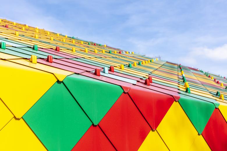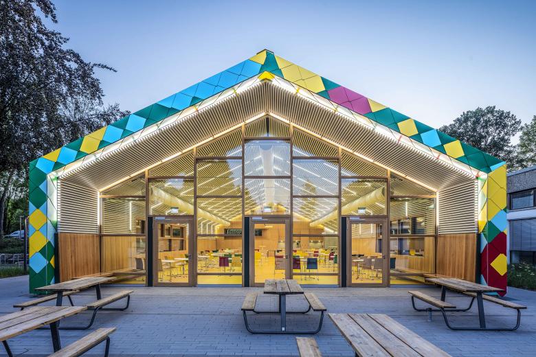Ihr Satteldach überdeckt den Speise- und Veranstaltungssaal stützenfrei und öffnet sich derart auch zum Campus. Als Archetypus fügt sich die neue Mensa in das Ensemble ein, ohne dem bestehenden Musiksaal das Licht und die Aussicht zu nehmen. Die farblich beschichteten Aluminiumrauten überziehen schindelartig Dach und Wand. Diese eine, gemeinsam gestaltete „Haut“ ist Symbol für das gemeinsame „Herz“, der in ihrer pädagogischen Ausrichtung so unterschiedlichen Schulen und ihrer Schüler*innen. Der offene, verglaste Giebel verbindet das Innen mit dem Außen zu einem Erlebnisraum.