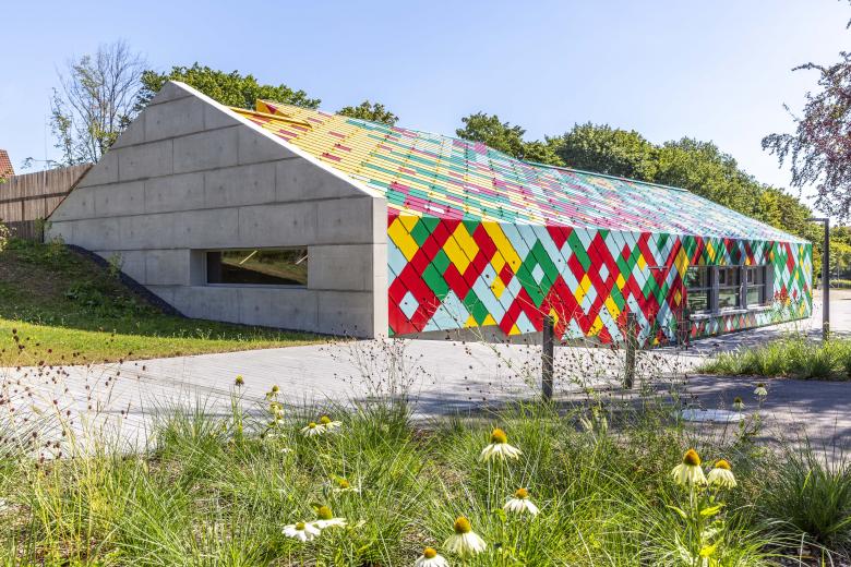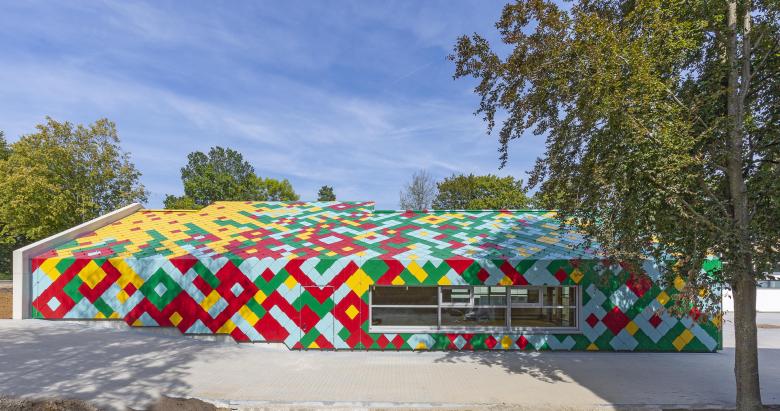 Mit der Wahl des Fassadenmaterials ergab sich die große Chance für das Projekt, die farbliche Gestaltung der Außenhaut an Hand eines ganzheitlichen, partizipativen und integrativen Prozesses durch eine Gruppe junger Schüler*innen beider Schulen erarbeiten zu können, begleitet durch engagierte Lehrer*innen. In sechs intensiven Workshops wurden viele Ideen und Varianten erarbeitet, gemeinsam diskutiert und daraus ein von allen getragenes, gemeinsames Farbkonzept entwickelt. Eine Blumenwiese für ein Picknick der Schüler*innen.