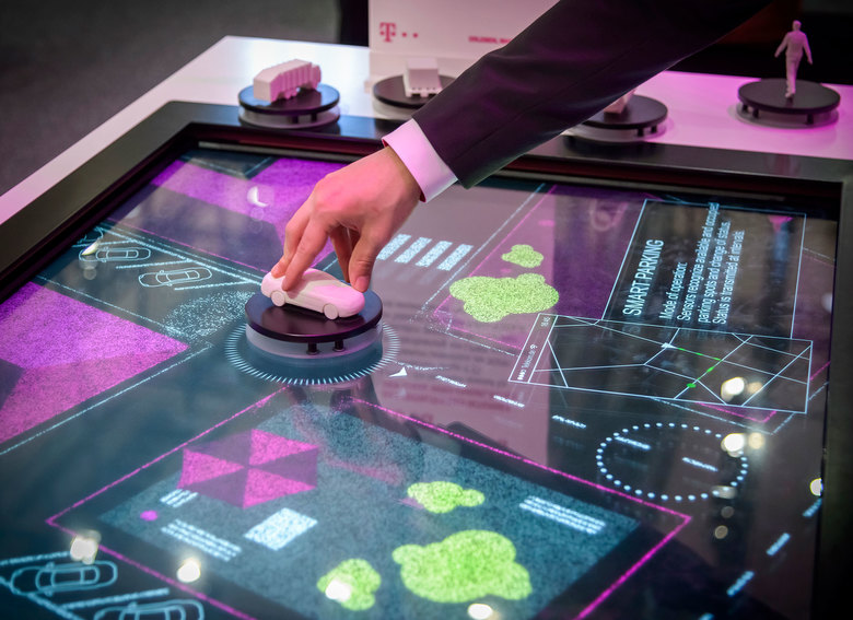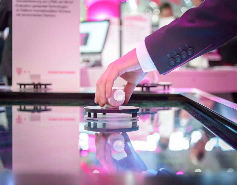 Interaktiv und im wahrsten Sinne greifbar – Multitouch kombiniert mit Objekterkennung kommt zum Einsatz, um die komplexen Zusammenhänge von Low Power Wide Area (LPWA) Networks darzustellen, die einmal die technologische Grundlage für Internet of Things (IoT)-Anwendungen bilden sollen. Die aus Partikeln bestehenden Animationen des Exponats symbolisieren die flächendeckende Sensorik auf der LPWA und damit auch das IoT basiert.