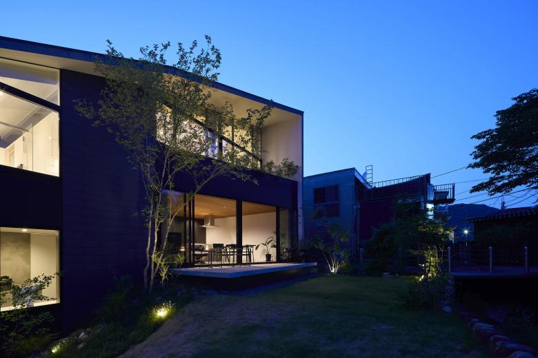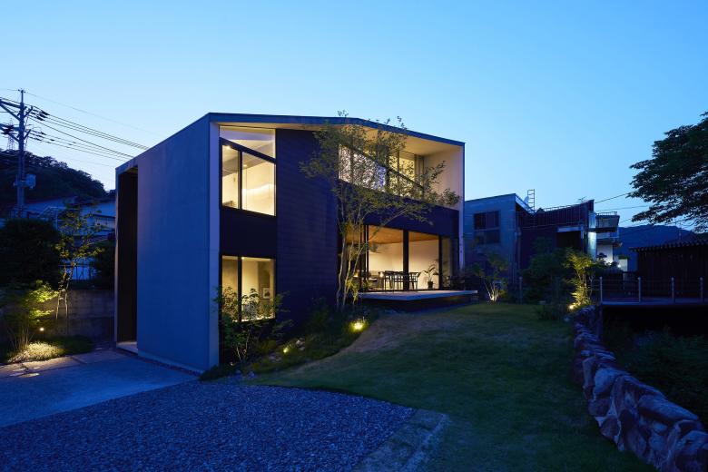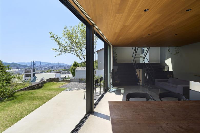 This house is located in a residential area that was built along the slope of a hillside in the middle of a mountain forest. Hiroshima City has many such residential areas, and the streetscape is gradually being updated as the population ages. The site has an unobstructed view from the east to the south in the foreground. To the east, there is also an old-growth forest left over from land development, and the distance between the site and the neighboring land was kept at a reasonable level.