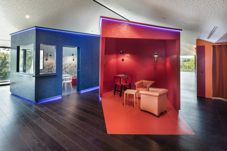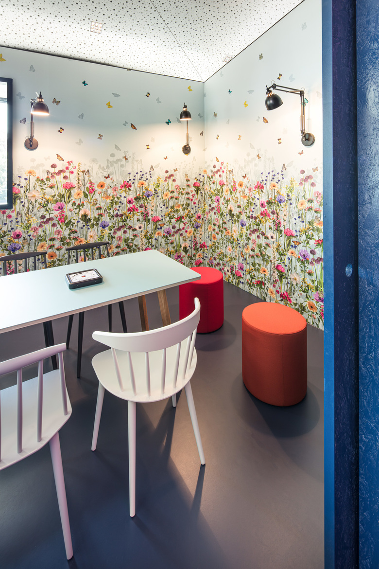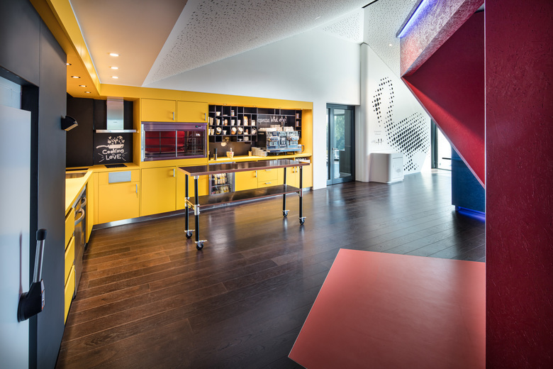 Die farbliche Gestaltung wurde den einzelnen Raumsegmenten und Zonen angepasst. So entstanden Bereiche in den Farben Rot, Blau, Gelb und Orange. Die großen Deckenflächen wurden mit modernen weißen Akustikplatten verkleidet. Die entsprechende Klimatechnik und LED-Beleuchtung ist geschmackvoll in die Deckgestaltung integriert worden.