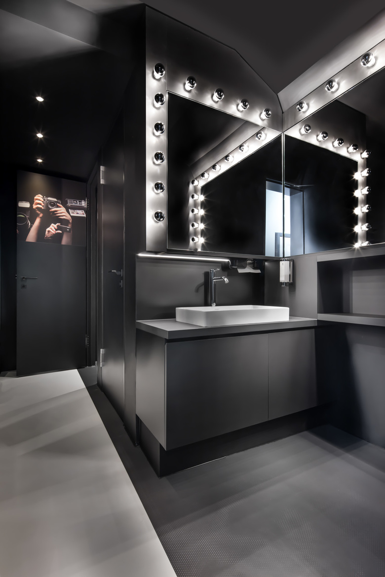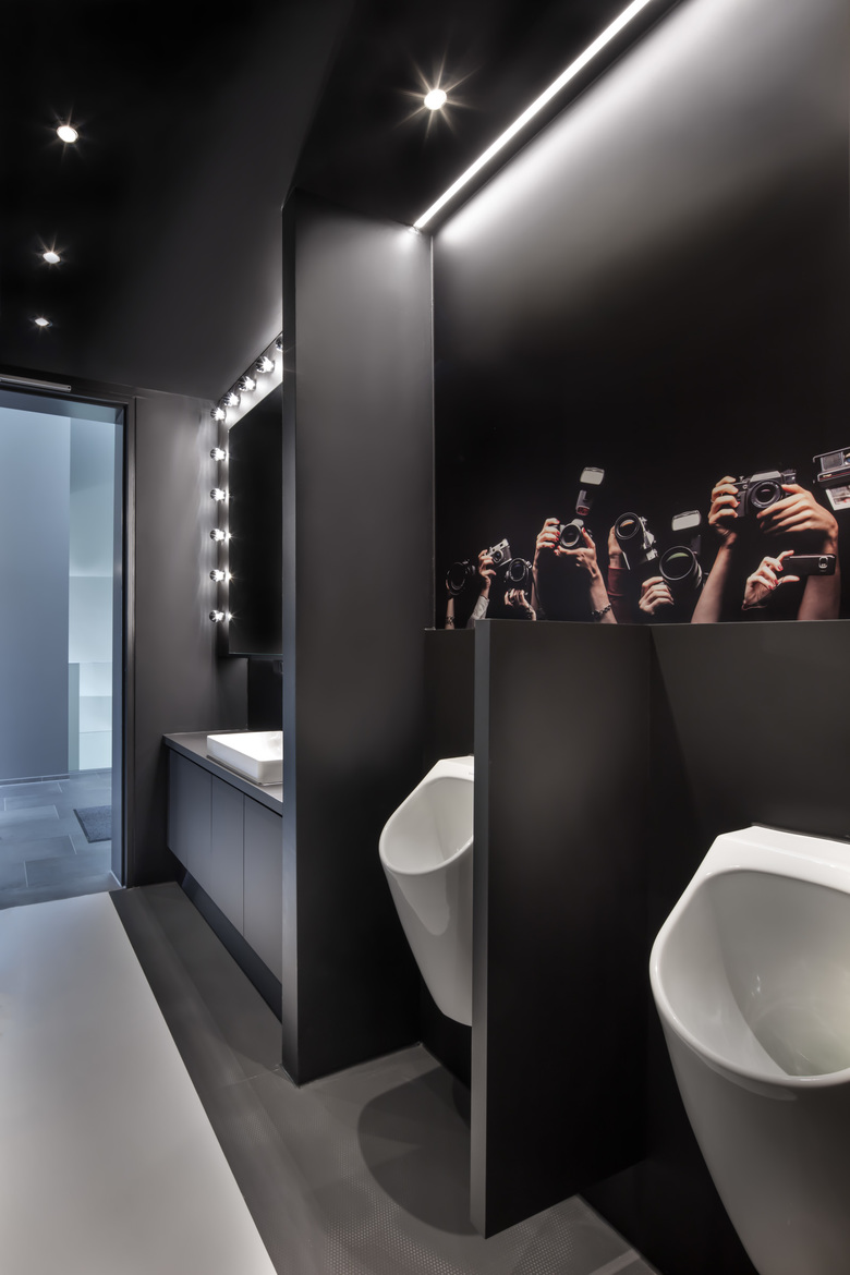 Auf den 250 m² entstand eine Veranstaltungsfläche mit hoher Flexibilität und einem ganz besonderen Einrichtungdesign. Die Mittelfläche des großzügigen Raums wurde mit einem dunklen Eichenparkett ausgelegt. Rechts und links dieser Hauptachse schließen sich Flächen an, die mit einer Stufe Niveauunterschied das Gesamtflächengefühl erhalten und dennoch eine angenehme Separierung schaffen. Auf der einen Seite entstanden Sitznischen aus kubischen Bänken und Sitzhockern, die Raum für kleinere Gruppenarbeiten bieten. Auf der Gegenüberliegenden Seite gibt es abgehängte, stylische Akustiksessel für etwas Ruhe und Entspannungsphasen.