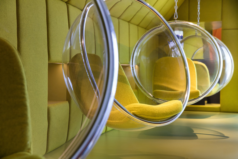 Besonders originell wurde die eigentliche Raum- in Raum-Lösung von den Innenarchitekten umgesetzt. Zwei Kuben aus Grobspanplatte wurden zwischen dem offenen Küchenbereich und dem Seminarraum platziert. Diese schaffen einen zusätzlichen Besprechungsraum sowie eine gemütliche Loungeecke, mit samtigen Sesseln, in einem warmen Tannengrün.